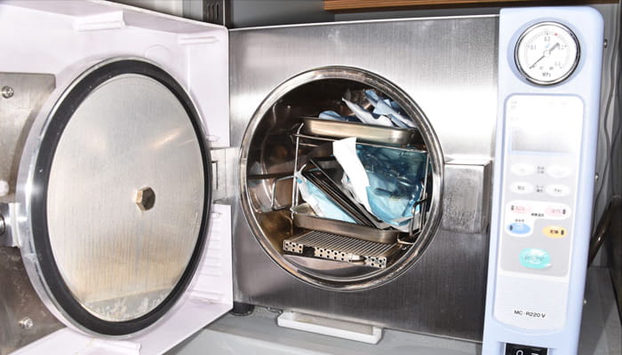 エプロン、コップは使い捨ての物を使用し、歯科用の器具は用途別に滅菌パックに封入して、高圧蒸気滅菌しています。